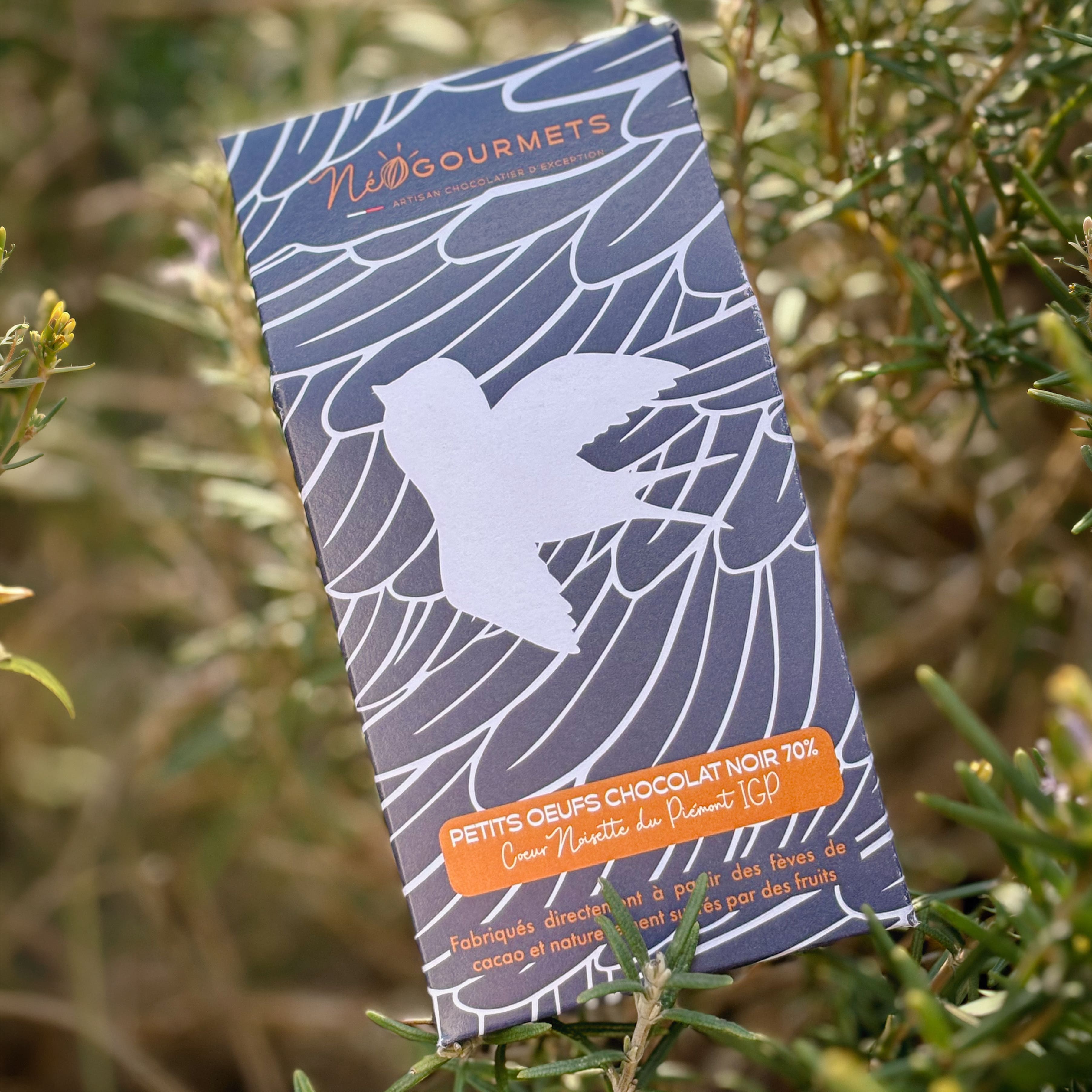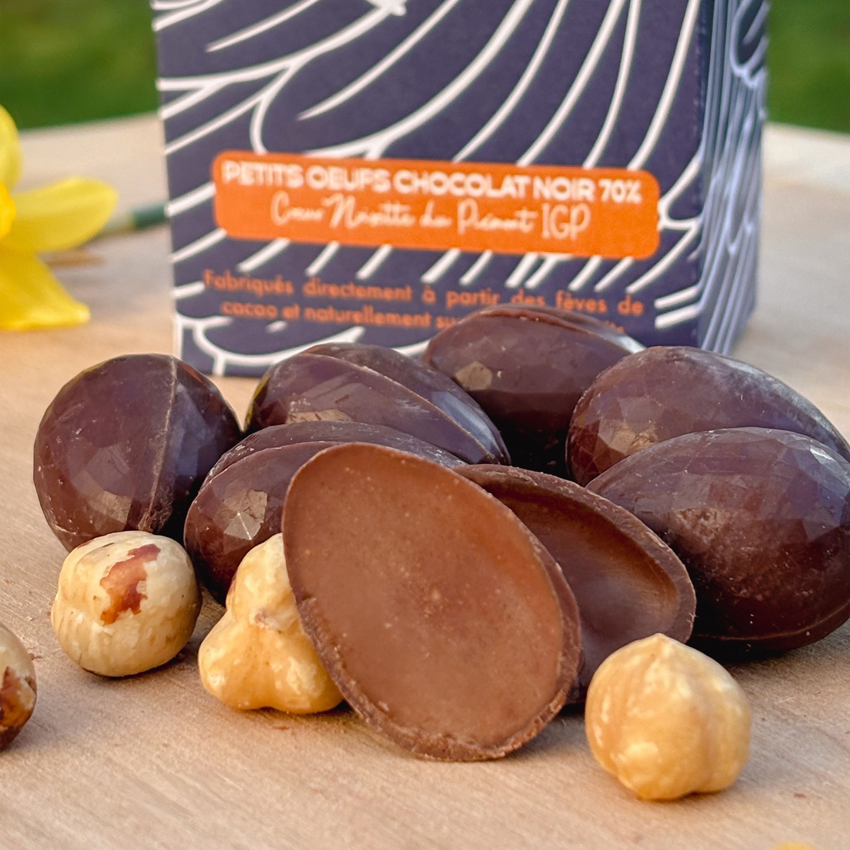 Succombez à nos petits trésors : un cœur onctueux aux noisettes du Piémont IGP, disponibles en chocolat Noir 70% ou en chocolat au lait 50% cacao. Une prouesse gourmande sans aucun sucre ajouté, où la puissance du cacao rencontre la finesse de la meilleure noisette au monde. Un moment de plaisir pur, niché dans son coffret au design "plumes". Notre best seller absolu pour Pâques que tout nos clients attendent ! Victimes de leur succès l'année dernière, ils sont de retour en édition très limitée.
