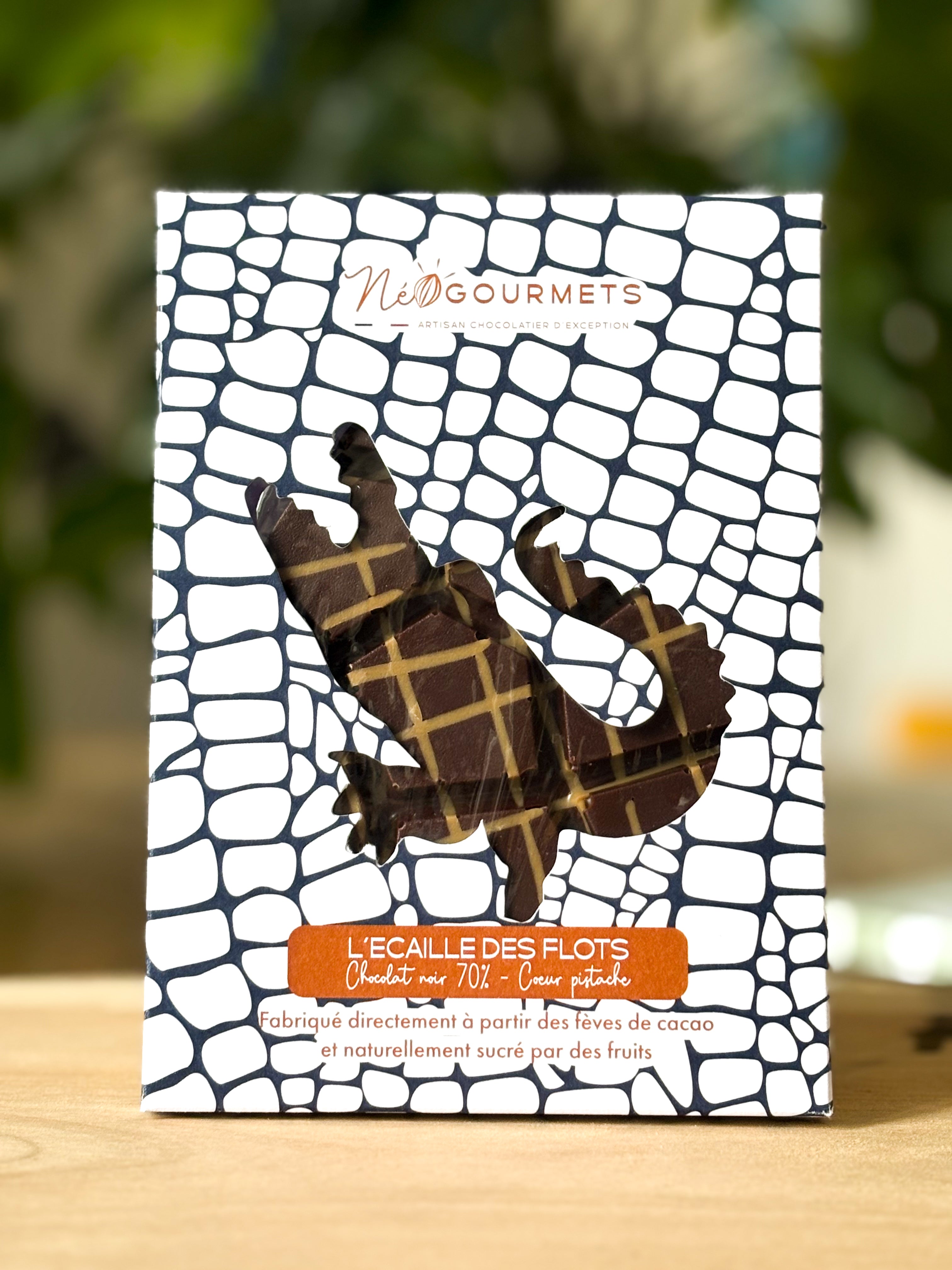 L'excellence du chocolat, de la fève à l'écrin. Oubliez les moulages industriels creux et trop sucrés. Découvrez notre pièce maîtresse de la collection exclusive "Échos Sauvages" : une tablette en forme d'œuf garnie d'un praliné généreux à la pistache. Travaillée à la main par Vanessa et Moko dans notre atelier au cœur de la Touraine, son motif quadrillé évoque les écailles du crocodile pour une œuvre unique.
