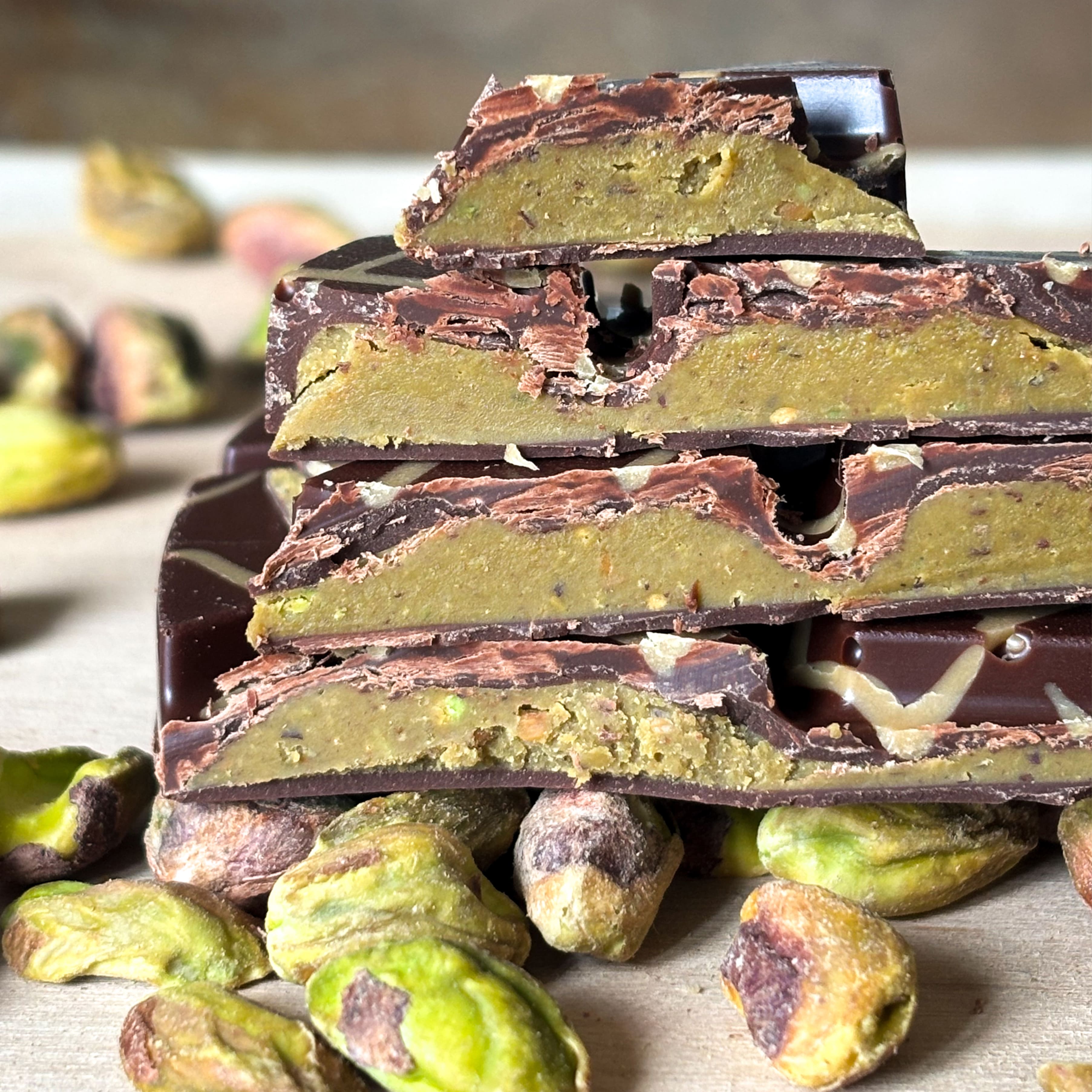 L’expérience intense & exotique : Le caractère de notre chocolat noir 70%, marié à l'onctuosité d'un cœur praliné aux pistaches et à l'avoine sans gluten. Une pointe de matcha vient sublimer la couleur et la profondeur de cette création, pour un voyage sensoriel sans aucune amertume superflue.